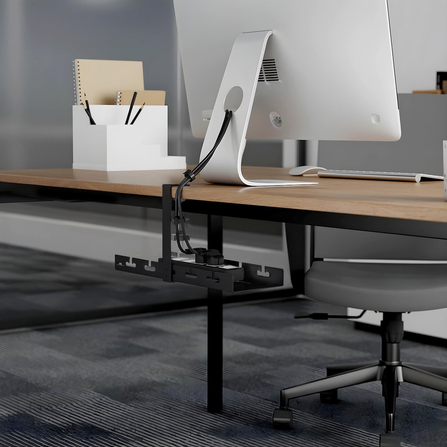 Keep your workspace neat and tidy with a desk-mounted organizer. This practical 40 cm long holder allows you to easily organize cables and mount a power strip without drilling or permanently interfering with the furniture.
