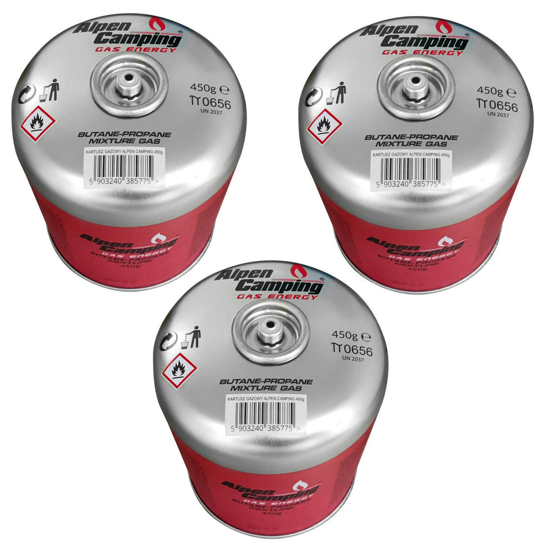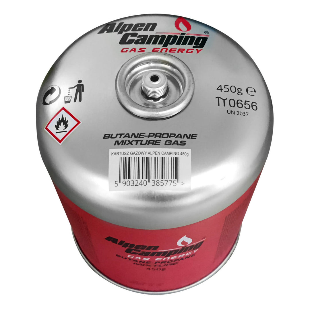 Alpen Camping 450g gas cartridge. certification: Pi 0437, complies with EN417, propane-butane, range -10°c to+ 40°c, 7/16" IK020 threaded valve, 3 pieces