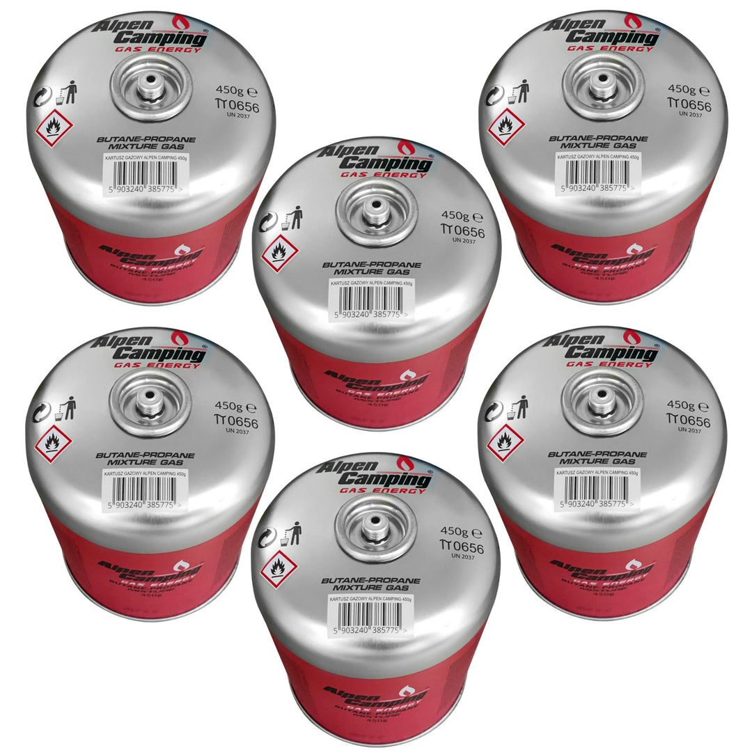 Alpen Camping 450g gas cartridge. certification: Pi 0437, complies with EN417, propane-butane, range -10°c to+ 40°c, 7/16" IK020 threaded valve, 6 pieces