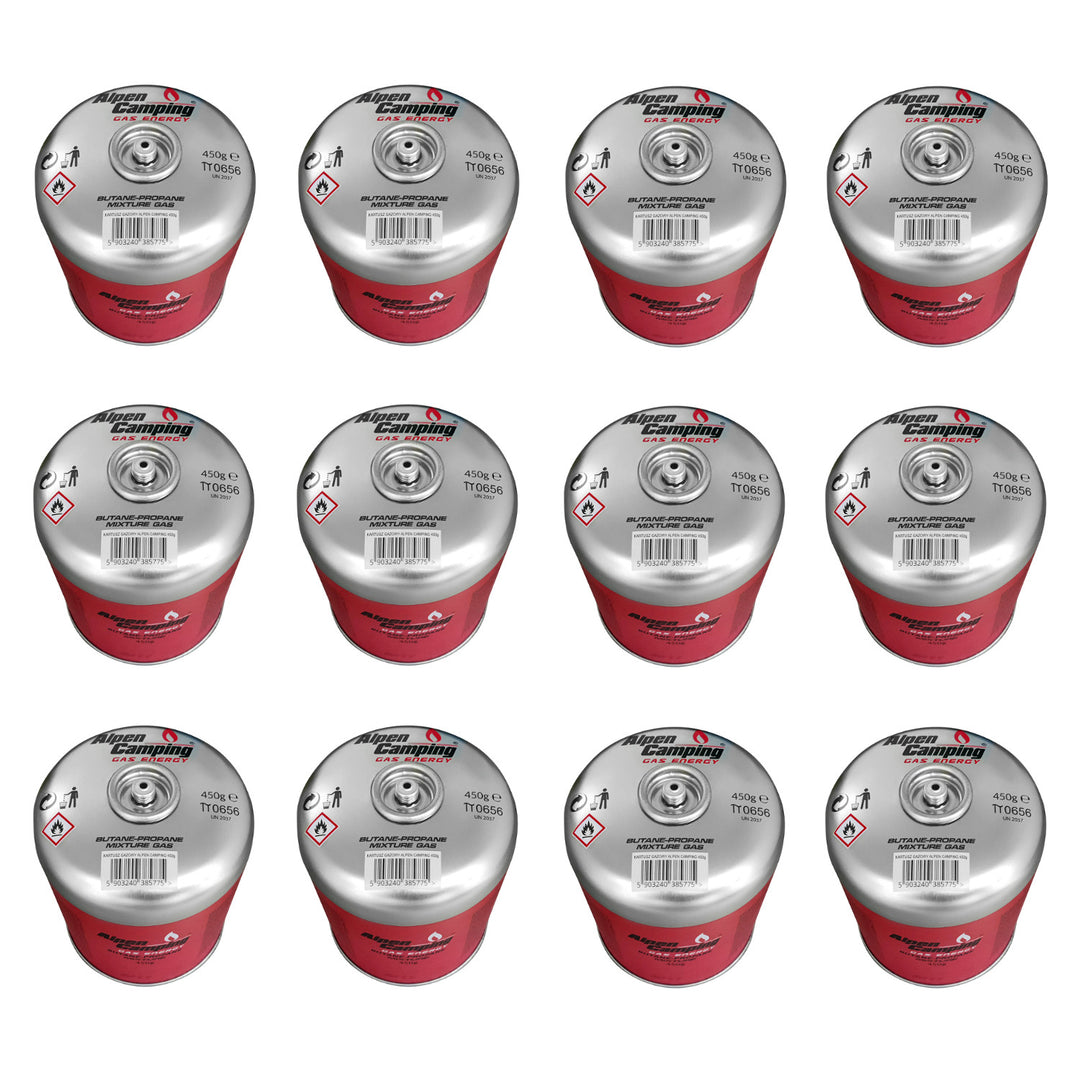 Alpen Camping 450g gas cartridge. certification: Pi 0437, complies with EN417, propane-butane, range -10°c to+ 40°c, 7/16" IK020 threaded valve, 12 pieces