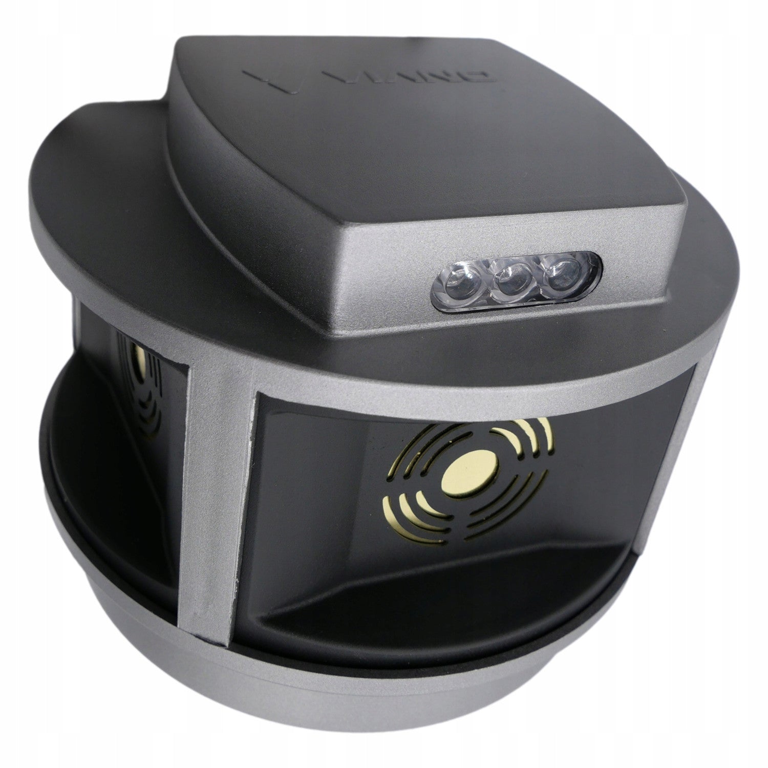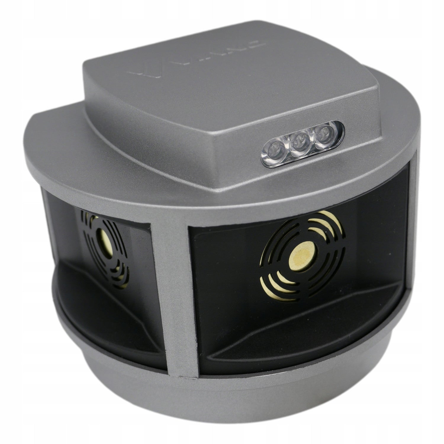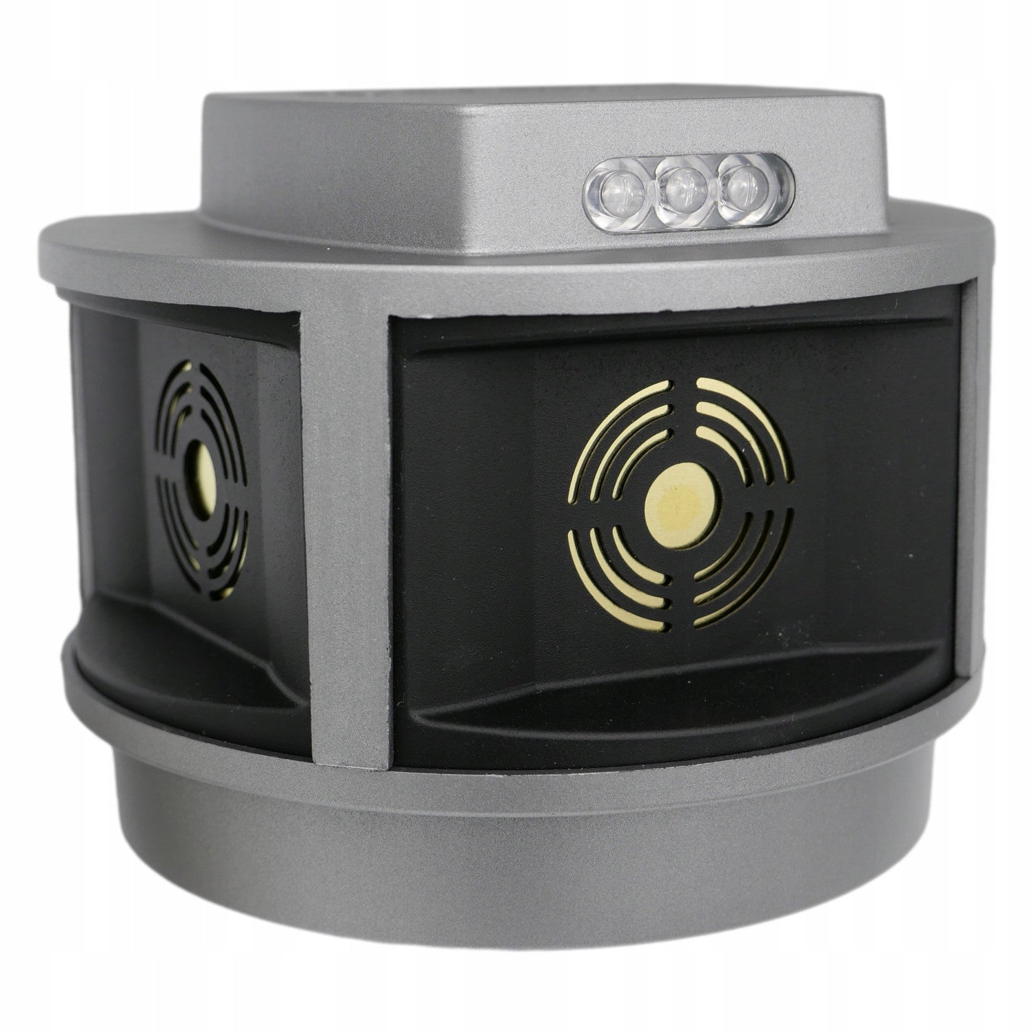 - Ein stroboskopisches Panel löst nach der Erkennung der geringsten Bewegung durch den eingebauten Radar des Geräts eine Reihe von starken Tönen aus, Dank der Anordnung der Lautsprecher, die senkrecht zueinander in drei Richtungen angeordnet sind, wird ein Aktionswinkel von bis zu 270 Grad erreicht