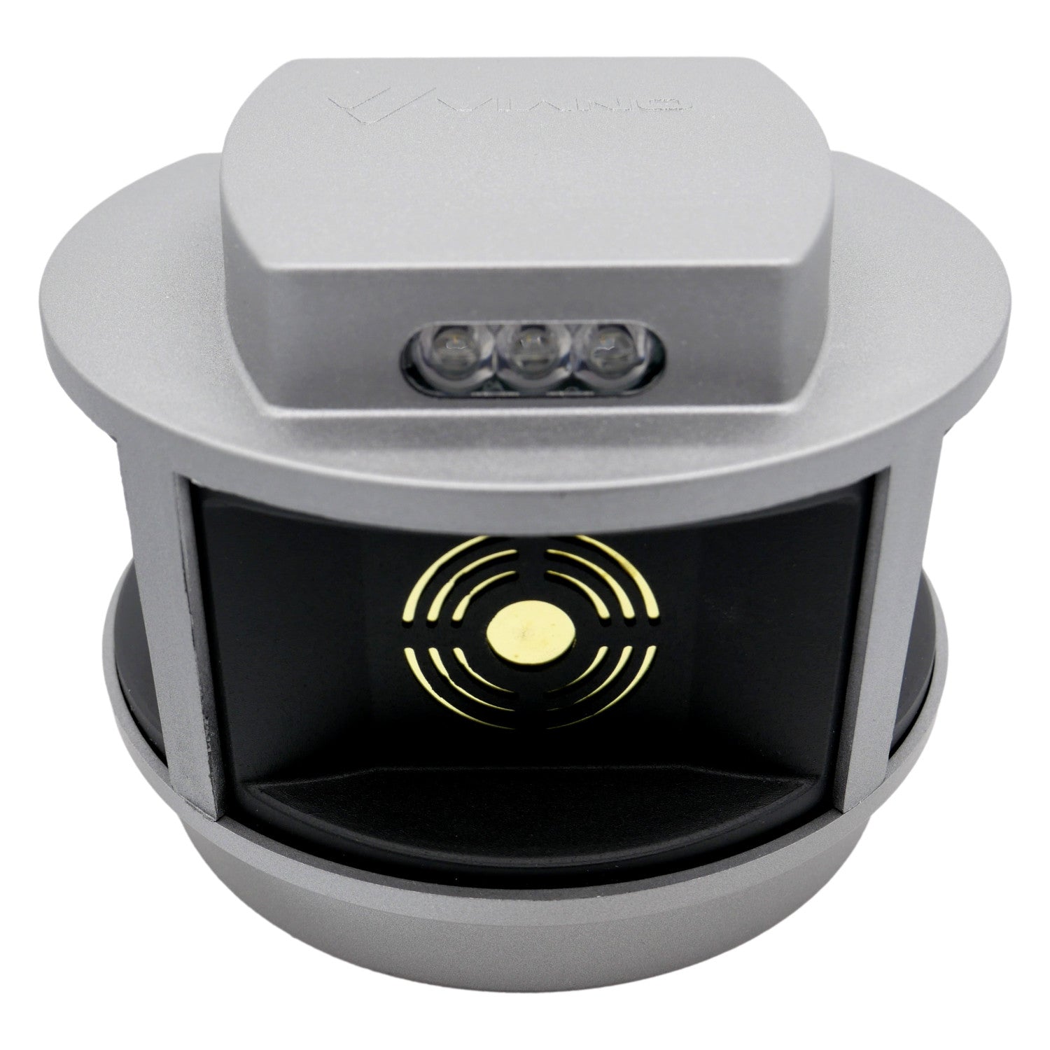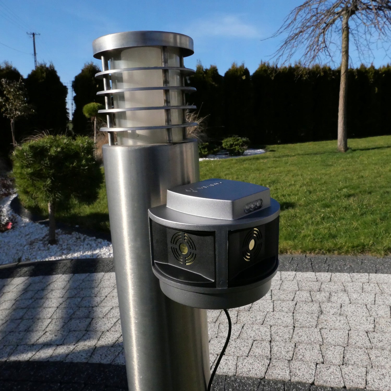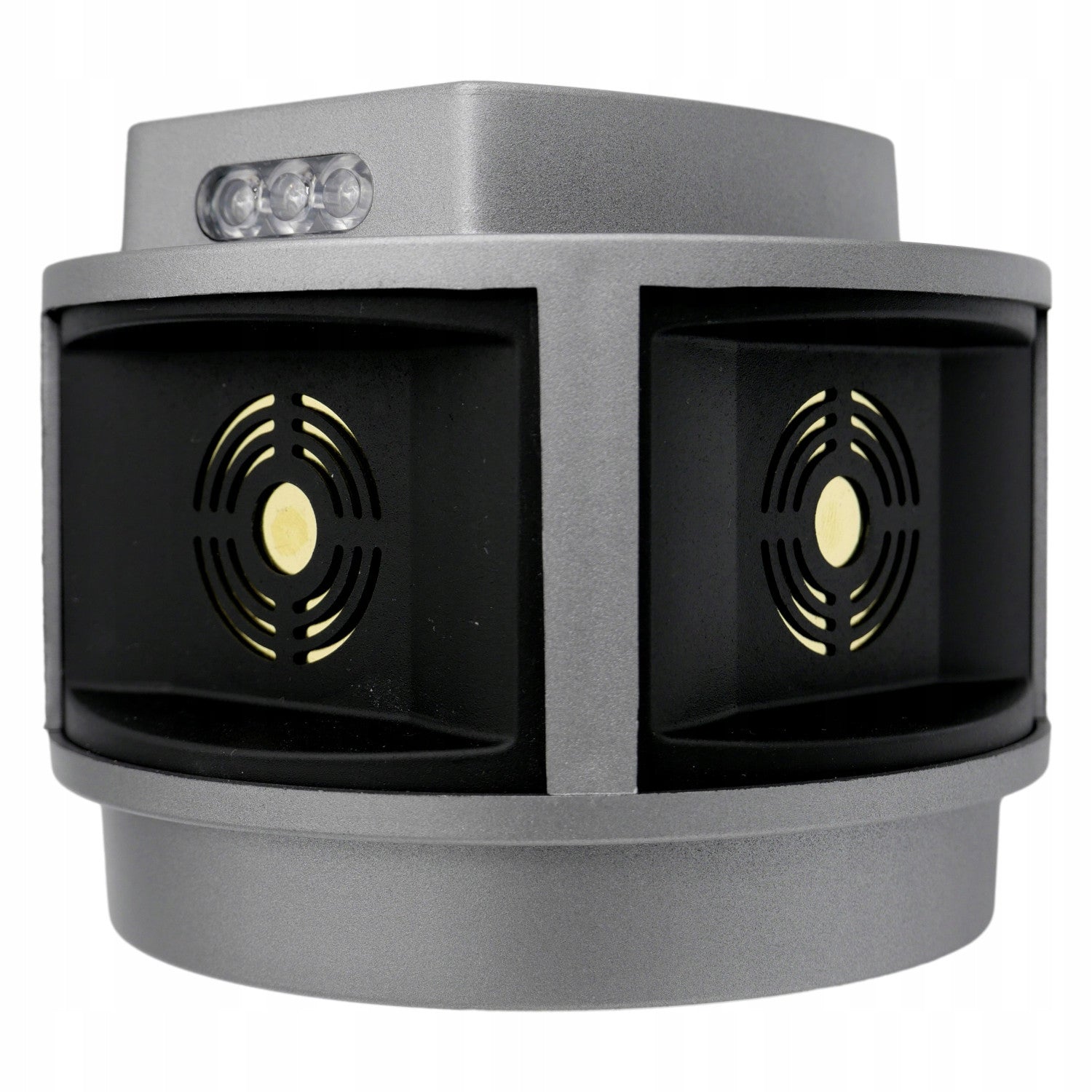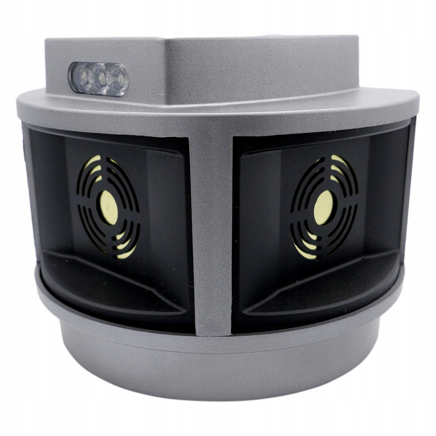 - Ein stroboskopisches Panel löst nach der Erkennung der geringsten Bewegung durch den eingebauten Radar des Geräts eine Reihe von starken Tönen aus, Dank der Anordnung der Lautsprecher, die senkrecht zueinander in drei Richtungen angeordnet sind, wird ein Aktionswinkel von bis zu 270 Grad erreicht