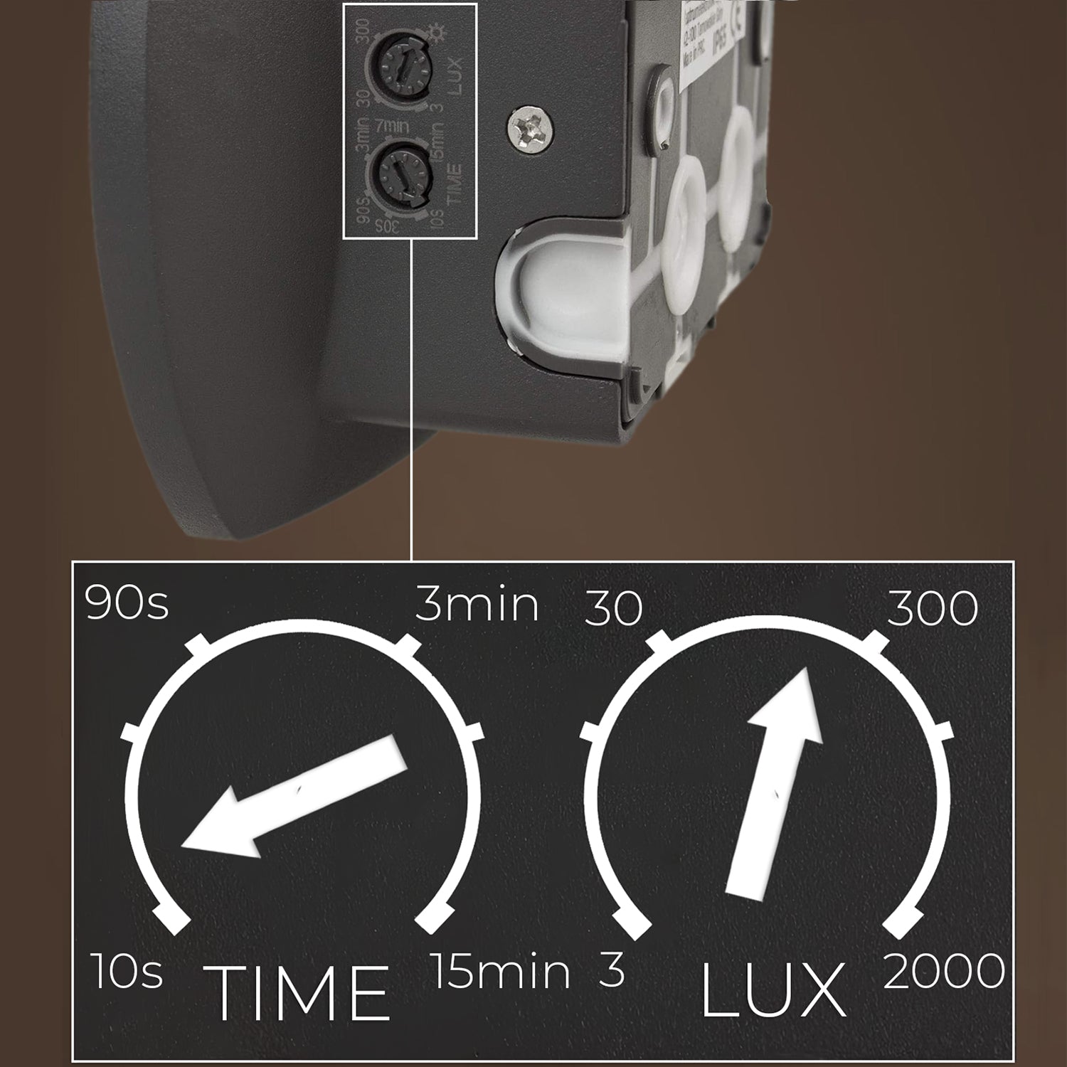 Dämmerungs- und Bewegungssensor Die Leuchte ist mit einer einstellbaren Leuchtdauer und Dämmerungssensor-Empfindlichkeit ausgestattet. Die Leuchte schaltet sich automatisch ein, wenn eine Bewegung im Bereich des Sensors erkannt wird, und schaltet sich nach Ablauf der eingestellten Zeit aus. Registriert der Sensor erneut eine Bewegung, während die Leuchte eingeschaltet ist, wird das Ausschalten verzögert.