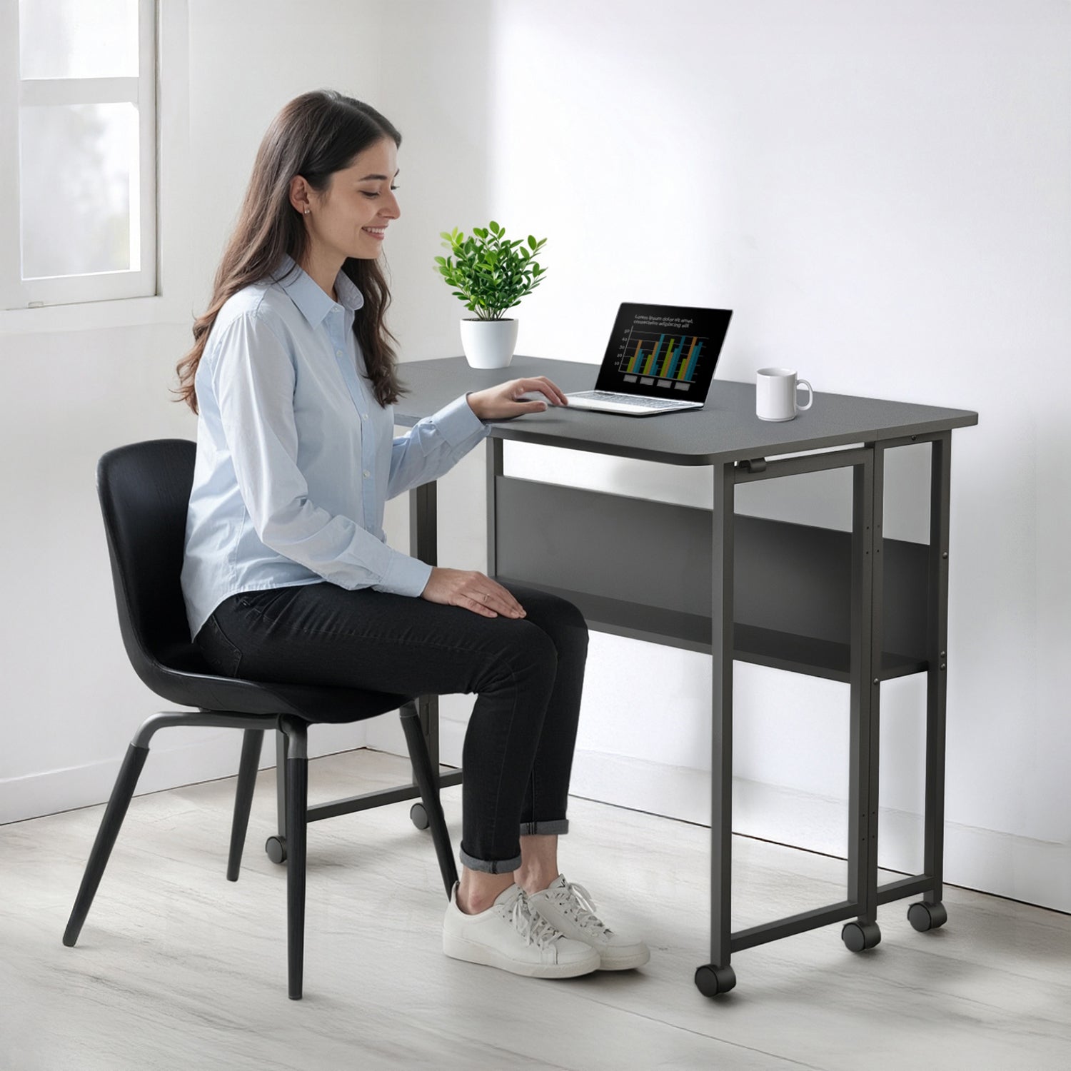 Das clevere Design ermöglicht es Ihnen, mit wenigen Handgriffen einen vollwertigen Schreibtisch in ein kompaktes, platzsparendes Möbelstück zu verwandeln. Dank der sechs feststellbaren Rollen lässt sich der Schreibtisch leicht an jeden beliebigen Ort bewegen und nach dem Anhalten in der gewählten Position arretieren.