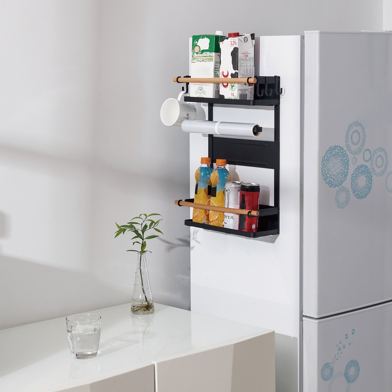 Durch die magnetische Befestigung z.B. an der Kühlschrankwand sind Produkte und Zubehör, die auf dem Regal platziert werden, immer in greifbarer Nähe.