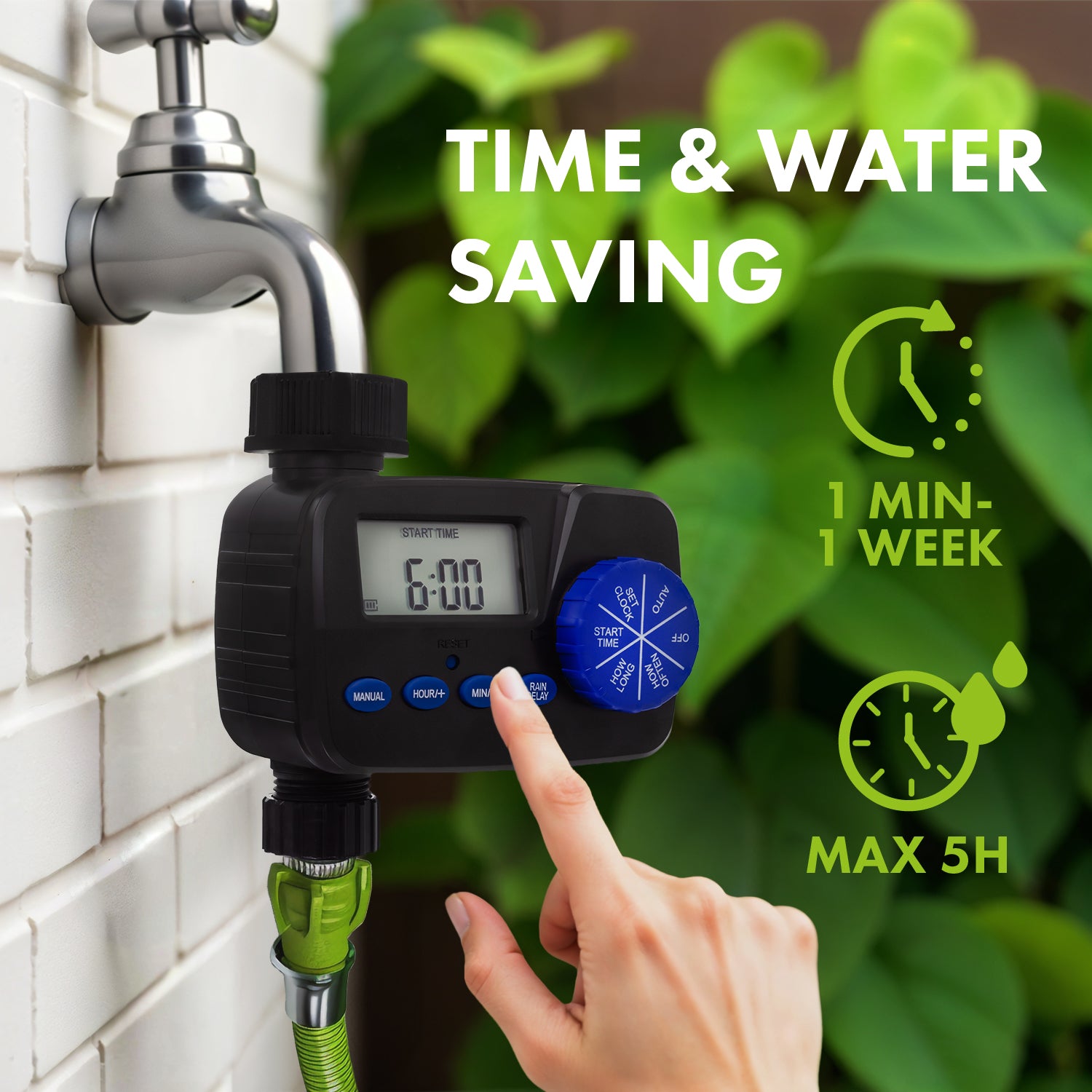 - Tiempo de riego ajustable - de 1 a 300 minutos