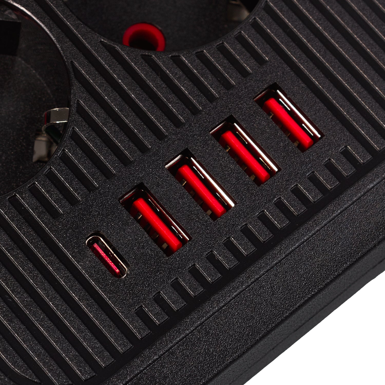 Plus de six prises réseau disposées sur deux rangées vous permettent de brancher confortablement de nombreux appareils à la fois, qu'il s'agisse d'ordinateurs et d'écrans, d'appareils électroménagers, de blocs d'alimentation ou d'éclairages. Quatre ports USB classiques et un port USB-C moderne vous permettent de charger des smartphones, des tablettes, des écouteurs et d'autres accessoires. C'est la solution idéale pour les utilisateurs de technologies modernes qui ont besoin d'une source d'alimentation universelle en un seul endroit.