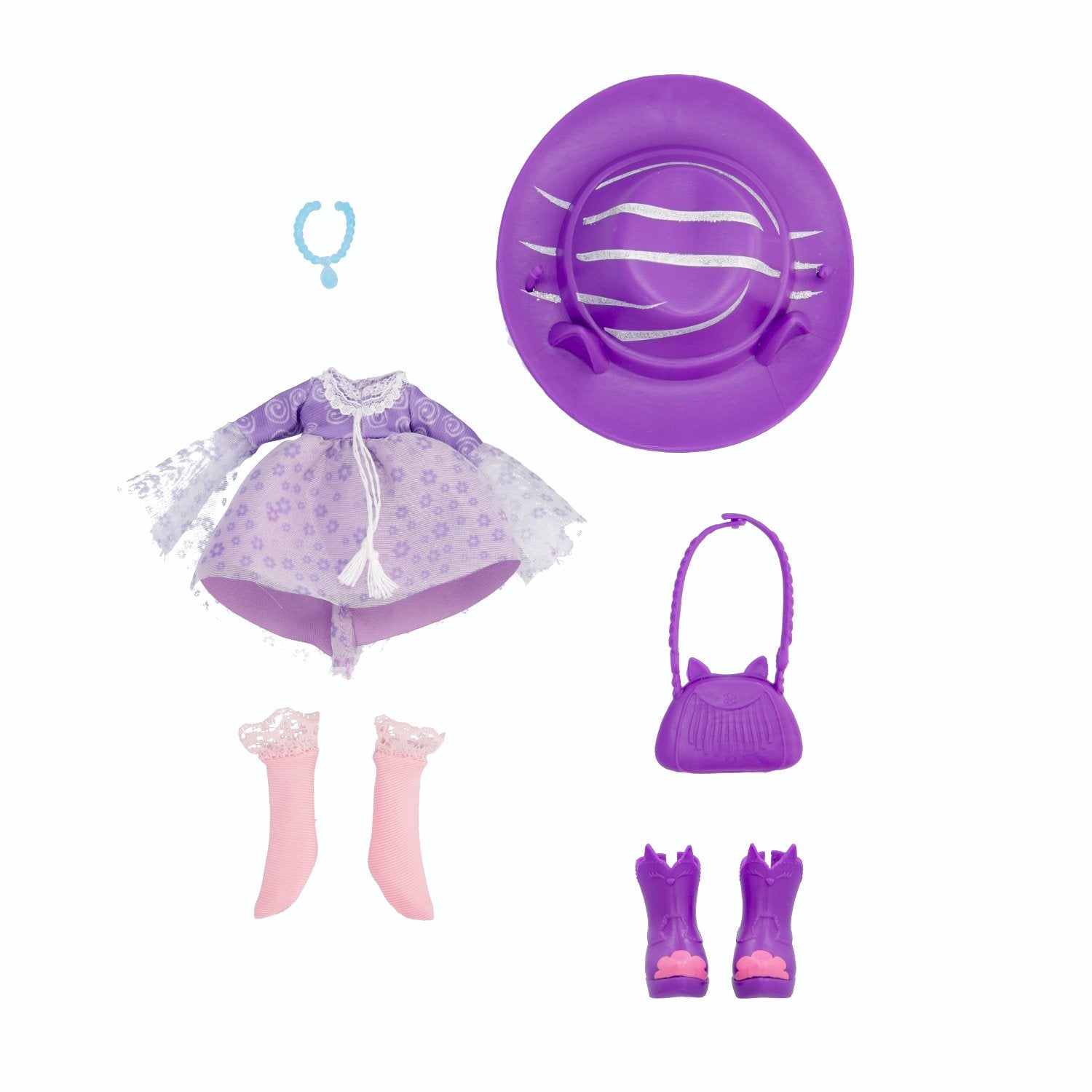 Katie - you'll recognize her by her pink hair with lots of braids! She's wearing trendy clothes: a lovely purple flowered dress, cute cat shoes and high socks. Her accessories include a purple purse, a big hat with cat ears and a lovely Bff necklace.
