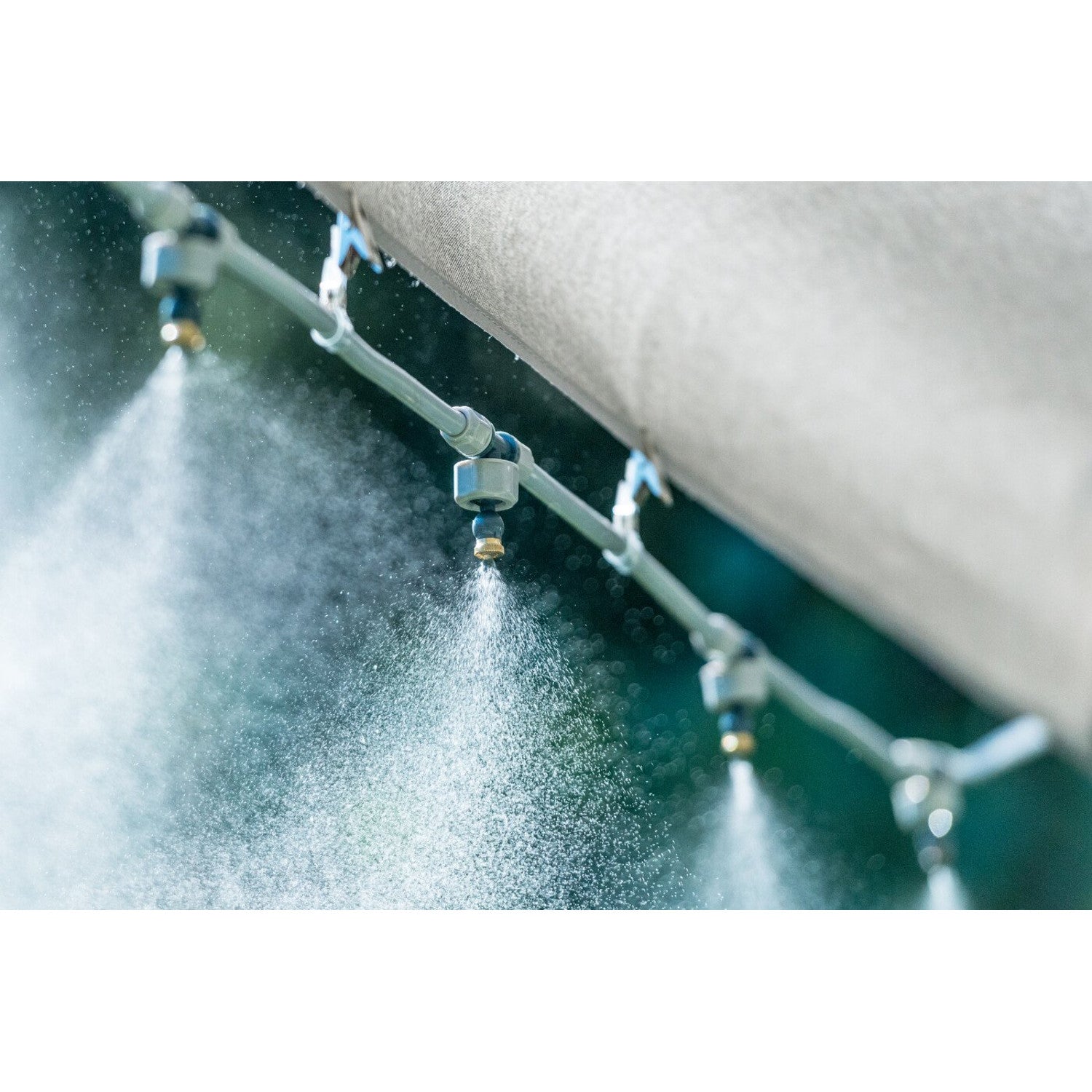 - Nozzles spray mist that cools the immediate environment, lowering the temperature by up to 11 degrees