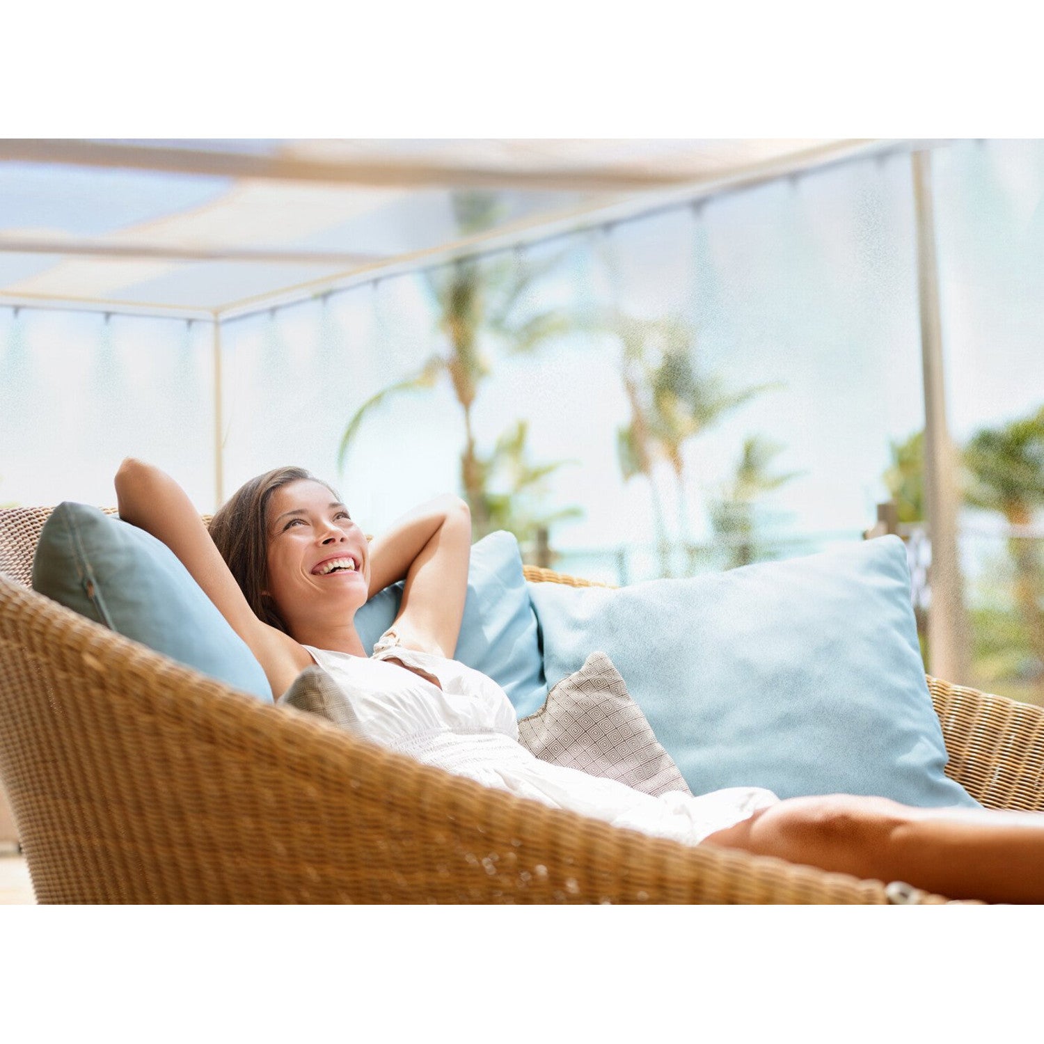 A water curtain kit from a reputable company Cellfast. It can be mounted on a roof, awning, umbrella or pergola. The nozzles atomize mist that cools the immediate environment, lowering the temperature by up to 11 degrees. There is a possibility of serial connection.