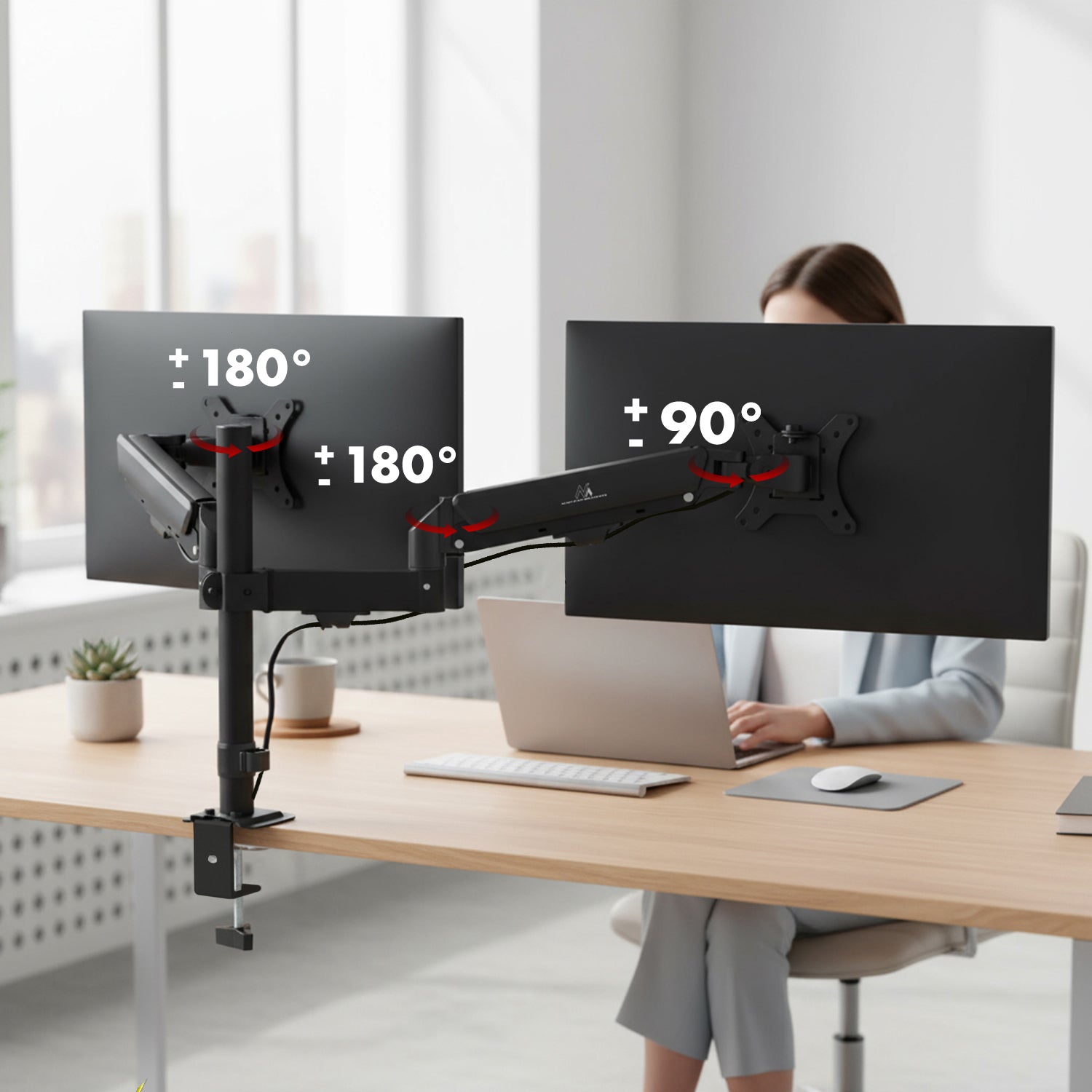 Elke arm van de houder werkt onafhankelijk, waardoor je de positie van beide schermen kunt afstemmen op jouw behoeften. Het ontwerp maakt het mogelijk om de hoogte van de bevestigingsarmen op de paal aan te passen, zodat je elke monitor op een andere hoogte kunt plaatsen en hun positie al tijdens de installatie kunt aanpassen. Het kantelbereik van elke monitor is -45° tot +45°, zodat je de kijkhoek perfect kunt aanpassen en reflecties kunt vermijden. De schermen kunnen ±90° zijwaarts worden gedraaid, waardoor het gemakkelijk is om samen te werken met de persoon naast je of om de schermen aan te passen aan verschillende toepassingen. De armen draaien zowel aan de gewrichten als aan de paal, beide binnen ±180°, voor maximale flexibiliteit en volledige vrijheid van positionering. Met dit grote verstelbereik creëer je een ergonomische, overzichtelijke en volledig aanpasbare werkplek waarmee je de hele dag door een comfortabele, natuurlijke houding kunt aannemen.