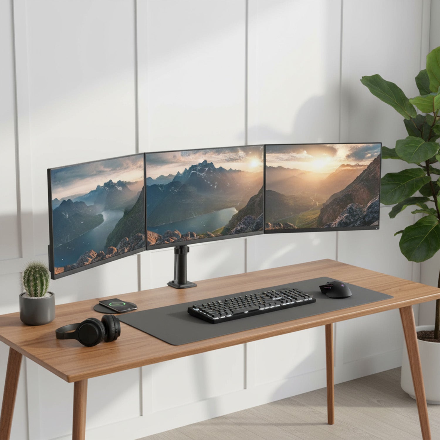 Monitoren kunnen worden gekanteld van -45° tot +45°, zijwaarts gedraaid ±90°, en de hele armen kunnen draaien aan de gewrichten en aan de paal met ±180°. Met deze flexibiliteit kun je de zijschermen precies zo plaatsen als je wilt. Een derde monitor, centraal gemonteerd, biedt een stabiel focuspunt voor de hele set, waardoor een perfect uitgebalanceerde lay-out ontstaat.