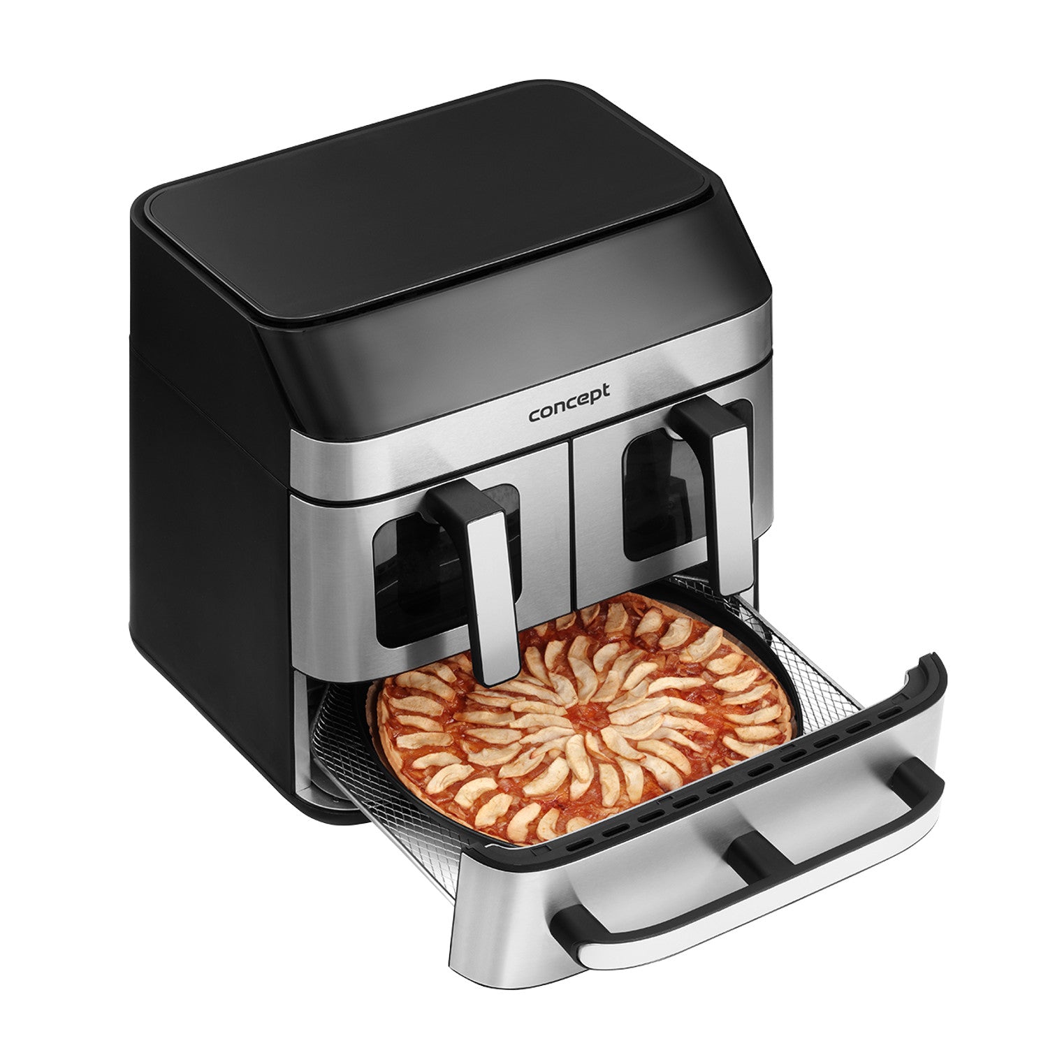 With the Concept FR9000 18.5L PIZZA TRIO non-fat fryer with two independent baskets and a multifunctional baking drawer, you will prepare a complete menu at one time. While you prepare a main course and a side dish in the fryer baskets, bake a cake for your afternoon coffee in the multifunctional drawer. This is new-generation cooking - fast, tasty, efficient and without compromise.
