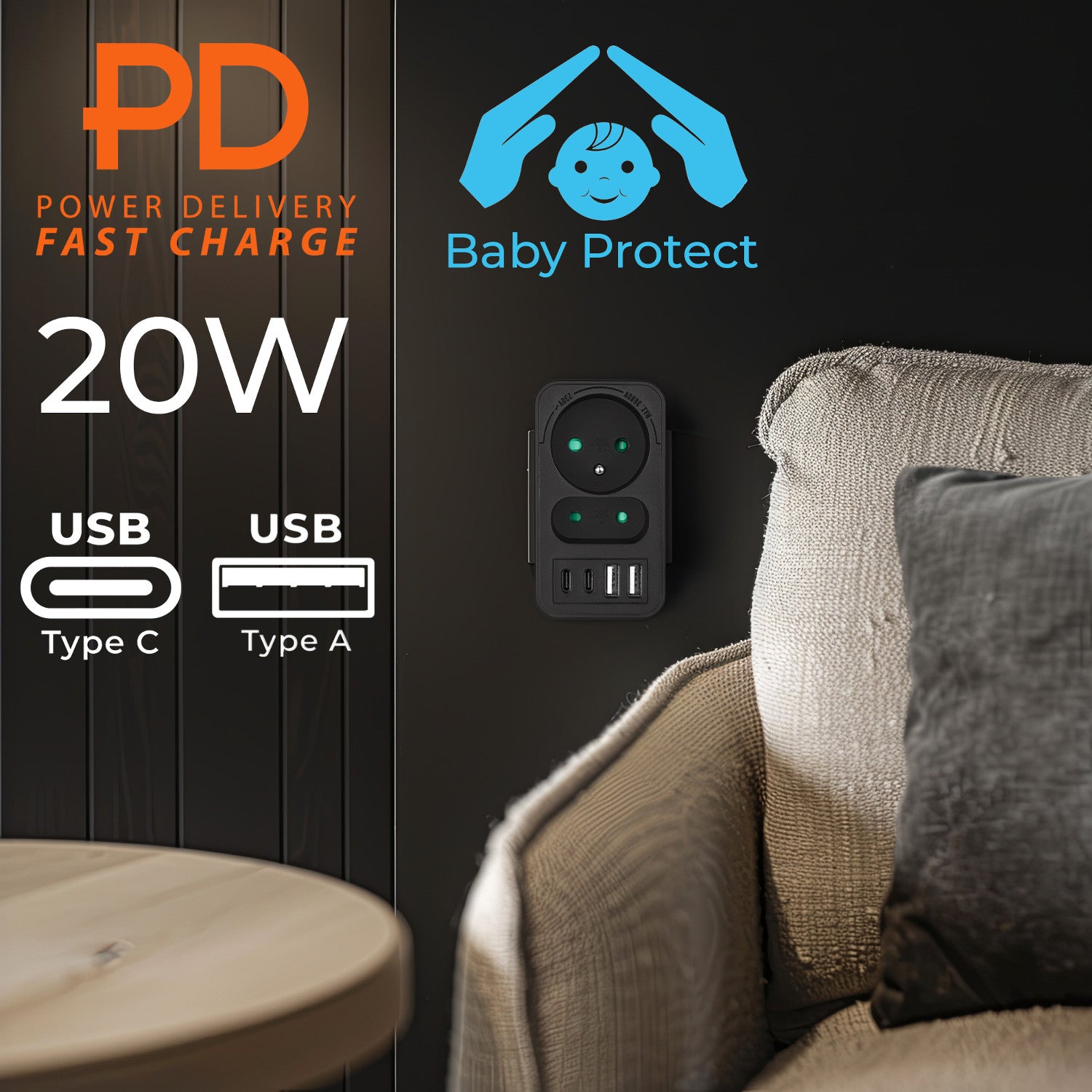 The integrated two USB Type A ports with up to 3A (max. 18W) are perfect for charging accessories such as wireless headphones, powerbanks, Bluetooth speakers or sports armbands. In turn, two USB Type C ports with Power Delivery technology (max. 20W) provide fast and stable charging of modern devices - smartphones, tablets, mobile consoles and other devices that support the Power Delivery standard. With this combination, you can simultaneously power multiple devices with different power requirements, without the need for additional chargers.