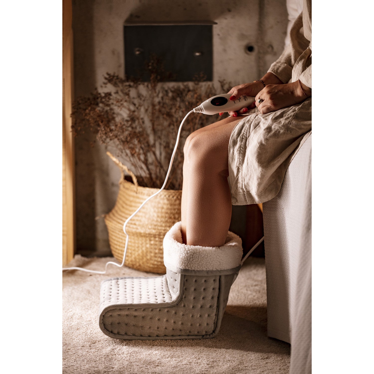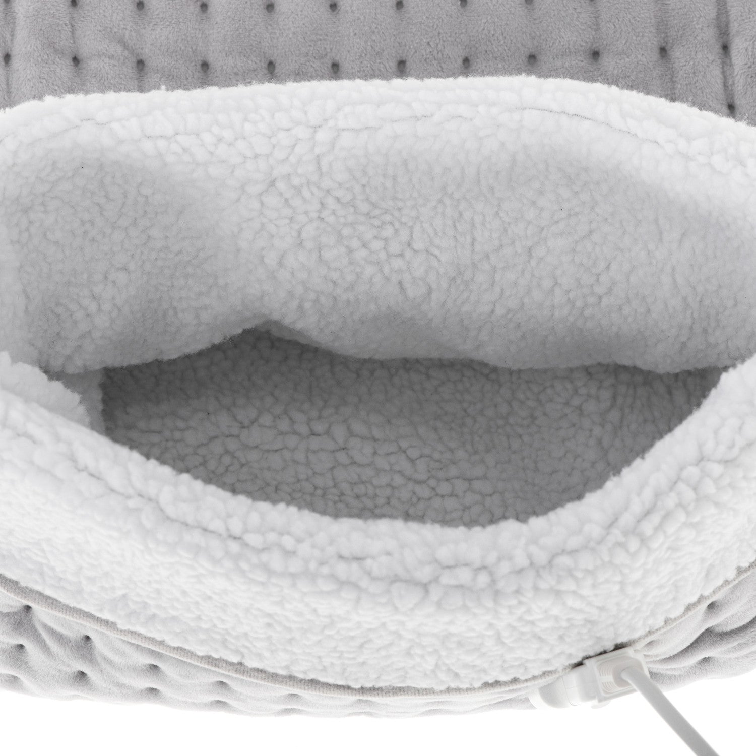 The foot warmer is the ideal solution for "cold feet" and people with circulatory problems of any age. The device allows you to adjust the heating temperature by selecting one of four heating levels. The size of the warmer is suitable for feet up to size 46. The device has an automatic shut-off function after 90 minutes to prevent overheating of the feet. The warmer is sewn with soft plush on the outside and cozy synthetic wool on the inside. The inner lining of synthetic wool is removable and can be washed for hygienic reasons.