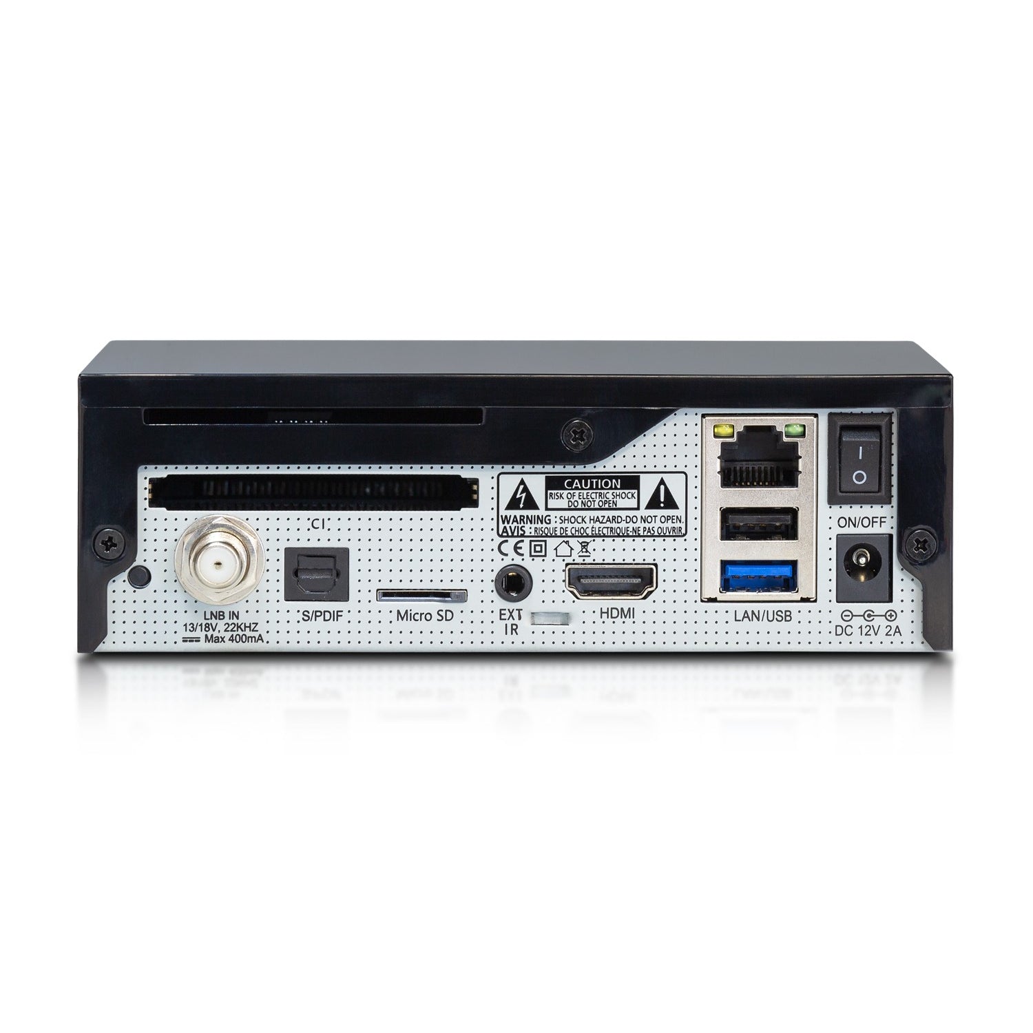 The slim and minimalist design of the receiver fits into any living room. On the front panel is an LED light that indicates whether the receiver is on, off or in standby mode. The LED light can be turned off completely if necessary. On the back there is a built-in DVB-S2X satellite tuner, 1x slot for a card reader, 1x slot for a CI module, 1x slot for a microSD card, 1x USB 3.0, 1x USB 2.0. The connection equipment also includes an optical digital audio output S/PDIF, RJ45-Ethernet, an infrared sensor (supplied with the receiver) and an input for an external 12V-2A DC power source.